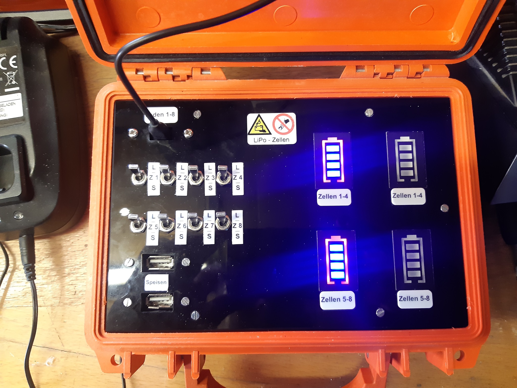 Über 8 Schalter kann ausgewählt werden, welche Zelle(n) geladen wird, welche speist und welche nicht genutzt wird.