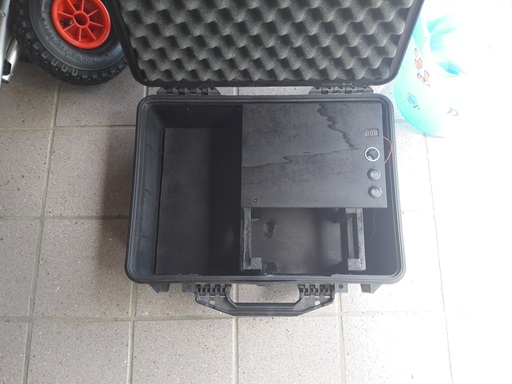 Damit wir unsere Kanus nicht immer von Hand aufpumpen müssen, habe ich eine 12V Pumpe mit Druckabschaltung in einen Peli-Koffer mit einem Akku gepackt. Am Anfang war es ein 12V Motorrad-Blei-Akku. Danach kamen 2 Stück 12V LiFePO4 Akkus. Diese ersten Versuche könnt Ihr in den nächsten zwei Bilder sehen.